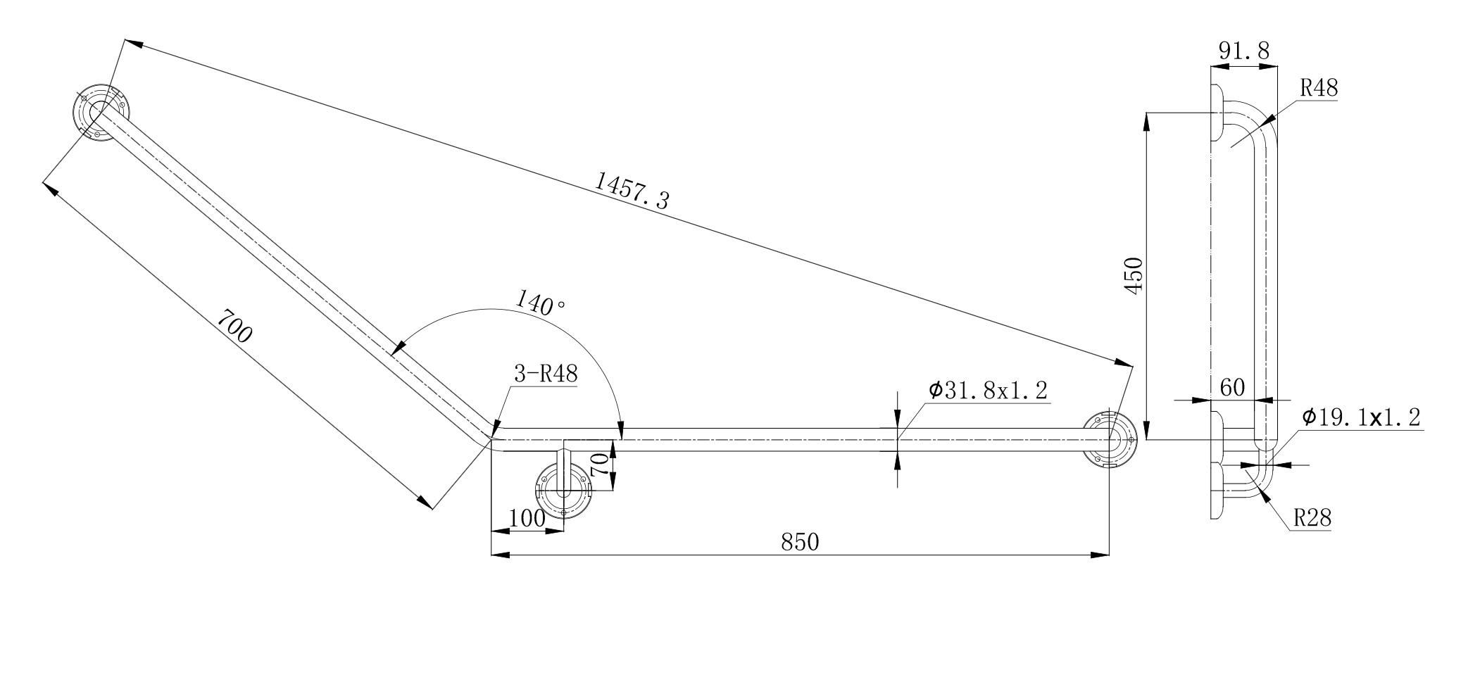 2. Amore Grab Rail 140 Degree 850 x 700mm Left Hand Angle